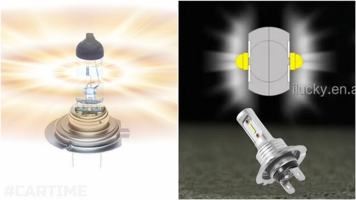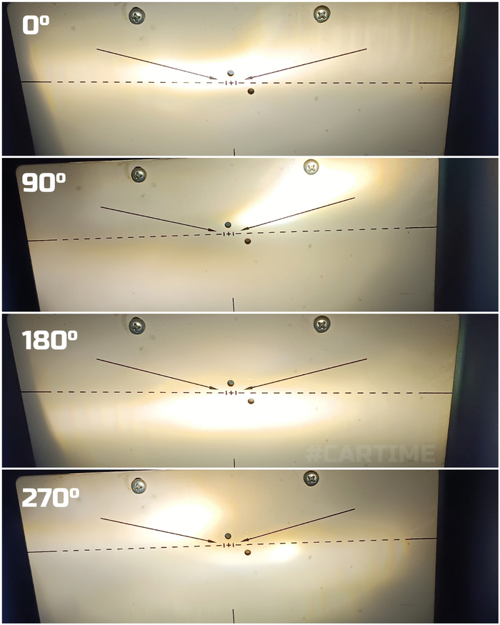А теперь вернём обратно говнолэд и покрутим лампу вокруг своей оси в поисках положения, при котором она будет максимально похоже повторять свет галогеновой лампы. Вы же помните, что при установке LED лампы в фару, её приходится поворачивать и наклонять относительно отражателя, добиваясь оптимального свечения? А все из-за того, что в отличие от галогеновой лампы, нить которой светит абсолютно во все стороны вокруг себя, лэд лампа охватывает не все направления, а соответственно и не весь отражатель.