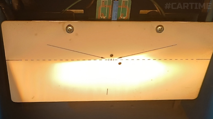 Начнём с того, что убедимся в том, что наши фары технически исправны. Для этого поставим перед машиной реглоскоп (прибор для регулировки фар) и посмотрим на пучки света. В левой фаре лампа была перегоревшая, поэтому показываю результат сразу после установки заведомо исправной галогеновой лампы и регулировки фары. Ближний — совмещаем границы пучка с линиями разметки.